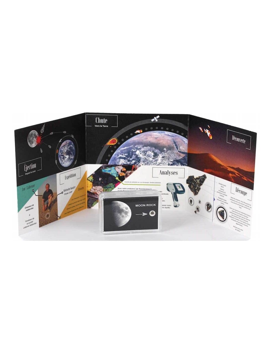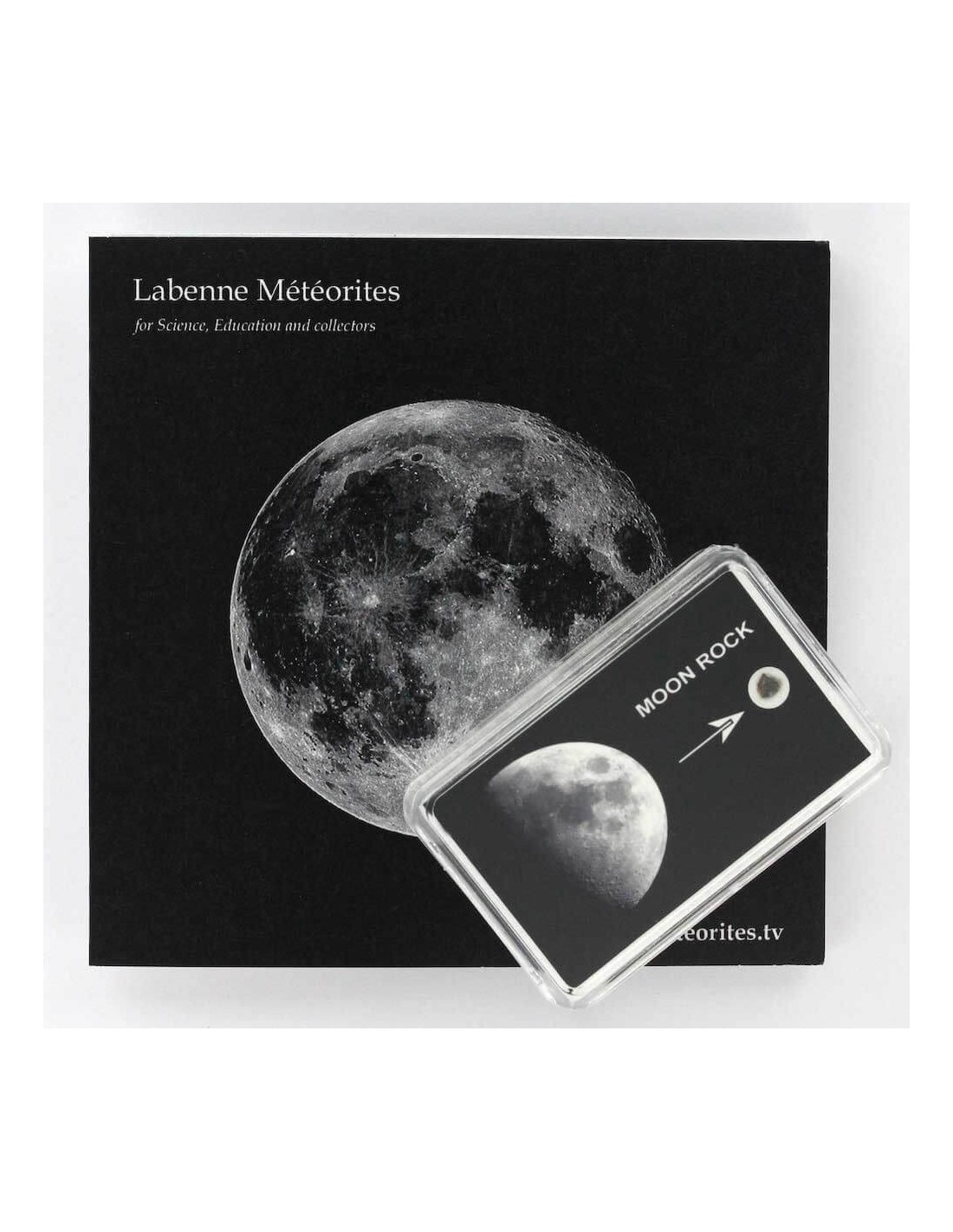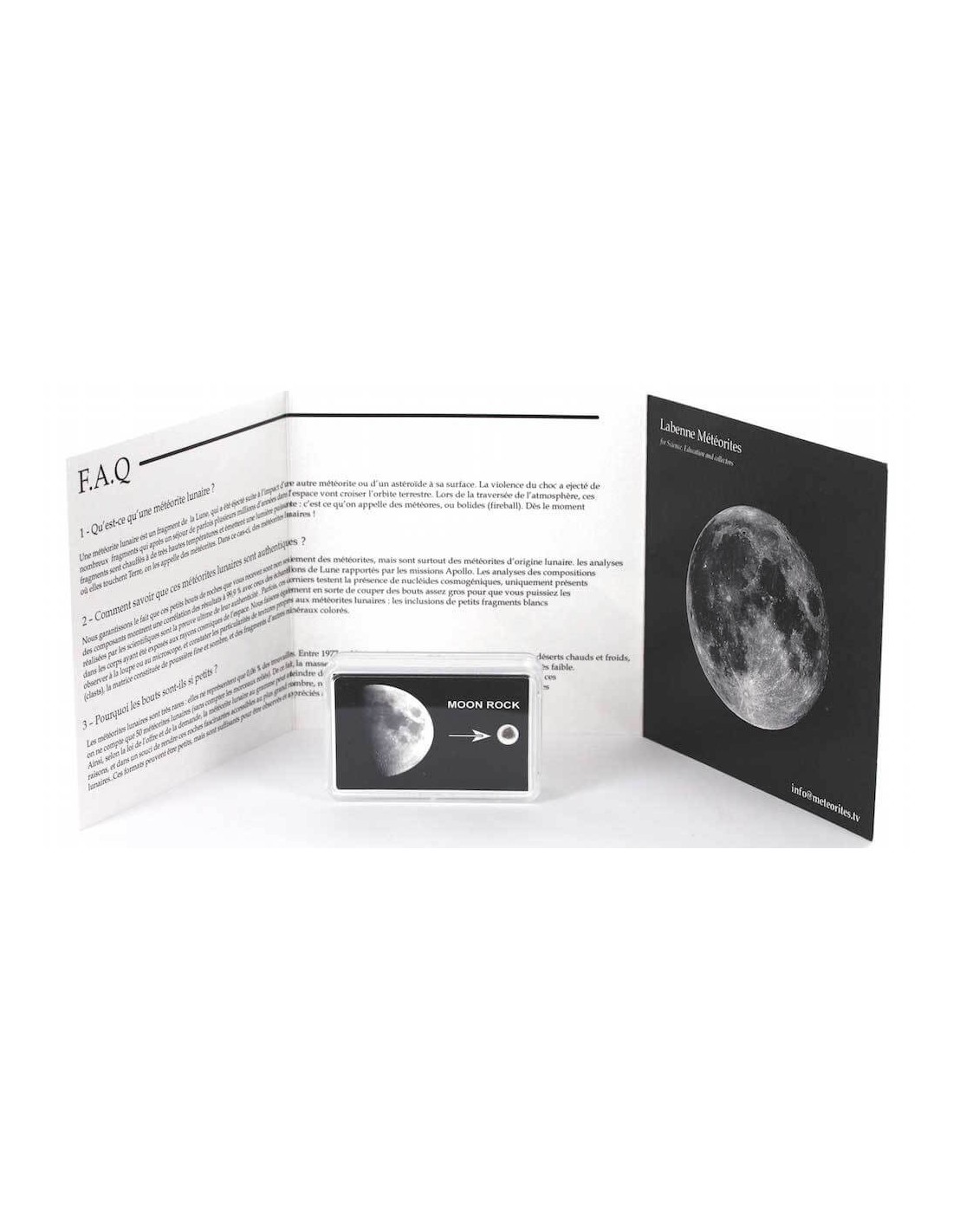 Fragment de météorite lunaire (roche lunaire éjectée de la lune par un impact puis découverte sur Terre) répertoriée sous le nom de NWA 10782. Le fragment, d'une taille minimum de 3 x 2 mm, peut être vu à travers le dessus de la boite qui est totalement transparente. Le morceau est assez grand pour être observé à l'oeil nu.