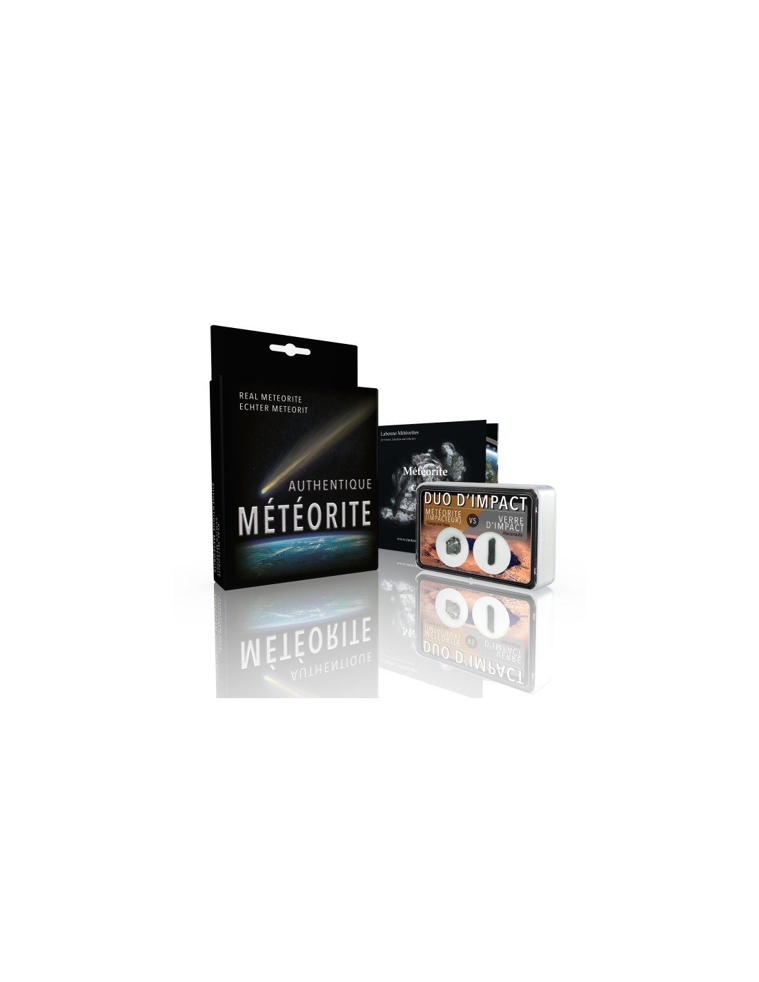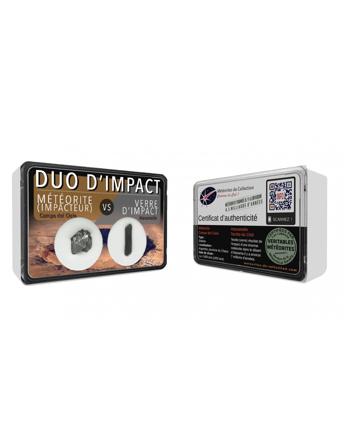 Toutes nos météorites sont livrées avec un certificat d'authenticité présentant un QR Code, qui permet de télécharger des informations plus approfondies. De plus, un dépliant présentant des schémas inédits sur les mécanismes de projection et chute de météorites répond à vos questions les plus fréquentes.