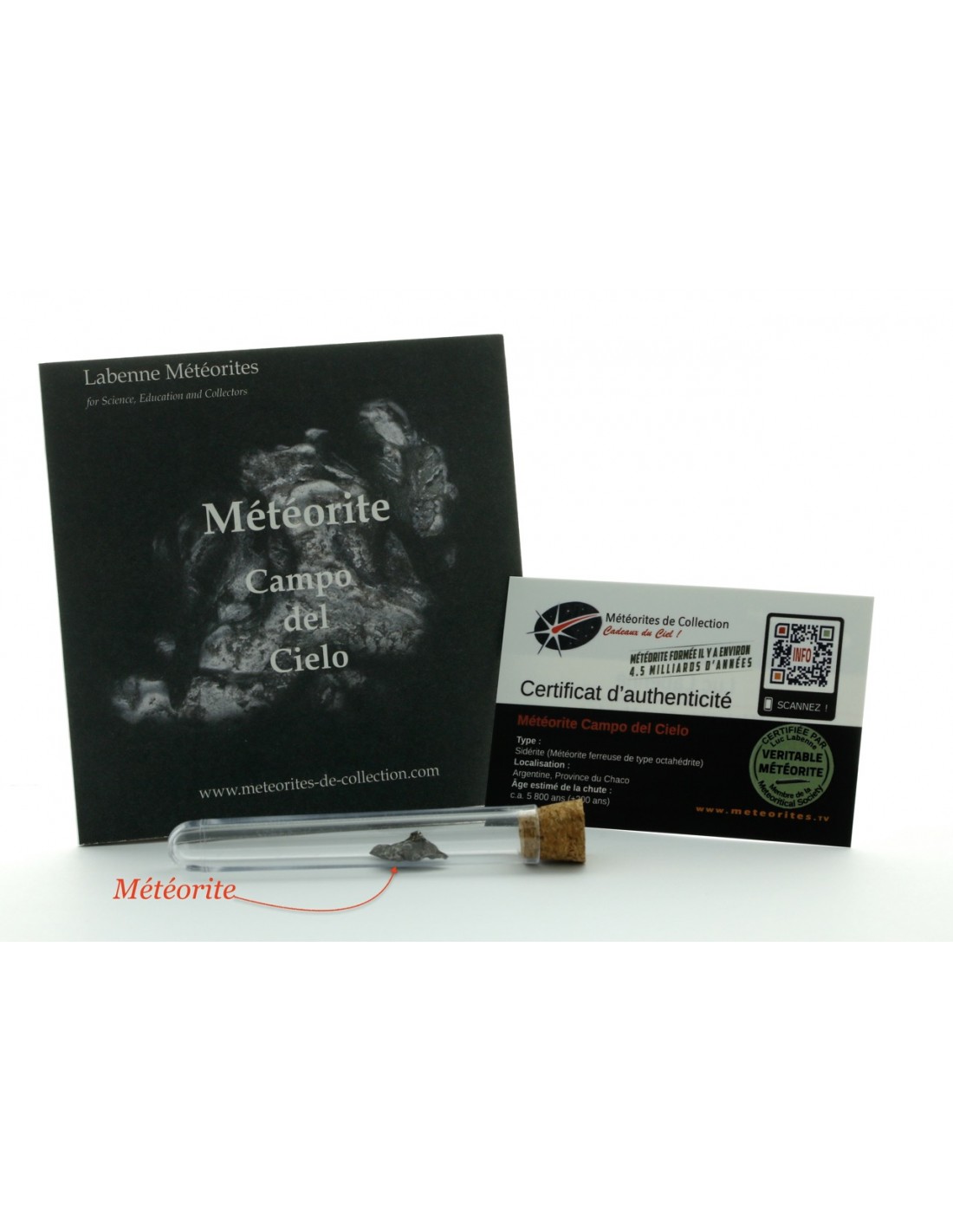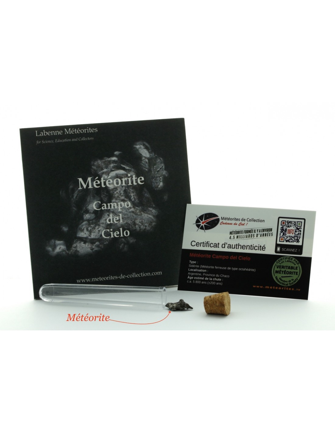 Les météorites sont livrées avec un certificat d'authenticité présentant un QR Code, qui permet de télécharger des informations plus approfondies. De plus, un dépliant présentant des schémas inédits sur les mécanismes de projection et chute de météorites répond à vos questions les plus fréquentes.