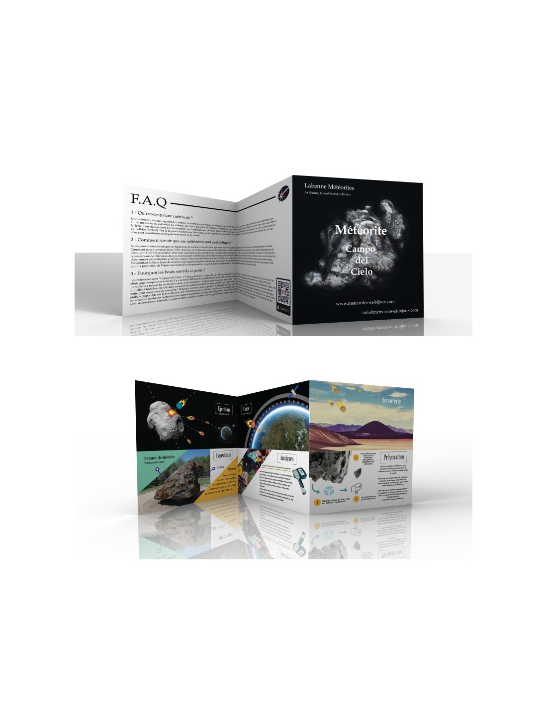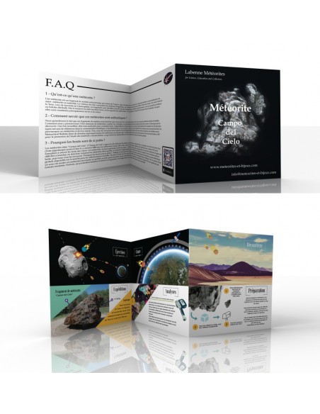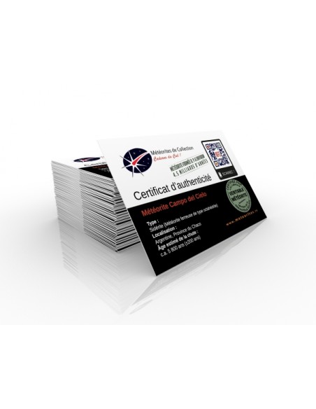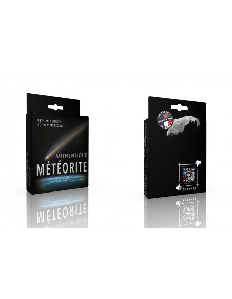 Les météorites sont livrées avec un certificat d'authenticité présentant un QR Code, qui permet de télécharger des informations plus approfondies. De plus, un dépliant présentant des schémas inédits sur les mécanismes de projection et chute de météorites répond à vos questions les plus fréquentes.